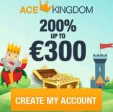 If you like Ace Kingdom Casino and want to continue your adventure with them, you can claim our exclusive welcome bonus. How to claim the promotion? Simply, make your first deposit an you will automatically get 200% up to £€$ 300 plus 30 gratis spins on top (no bonus code is needed). On your second deposit you are entitled to 50% up to £€$ 300 (bonus code: ACE50), and on third purchase can claim 75% up to £€$ 300 (bonus code: ACE75).