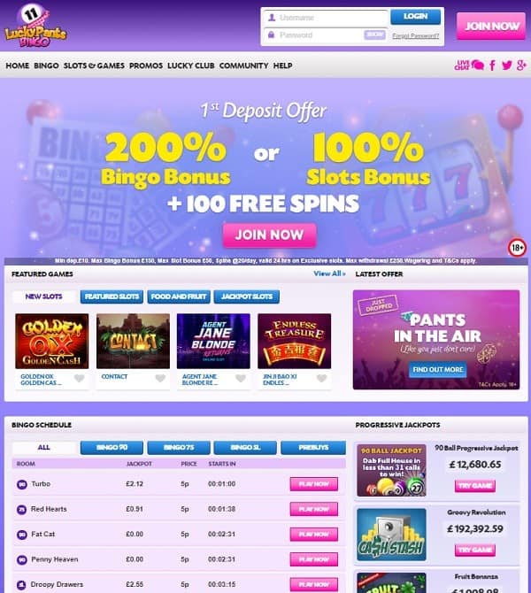Newbies will find one of the best after-deposit offers at Lucky Pants Bingo. Just register and make your first deposit to qualify for: 200% bingo bonus or 100% slots bonus. Plus, get 100 free spins on slot machines. On your 2nd deposit, get a 100% bingo bonus or 50% slots bonus. And, on your 3rd deposit, get a 150% bingo bonus or 75% slots bonus. Min deposit £10. Max bonus, wagering and withdrawal restrictions apply.